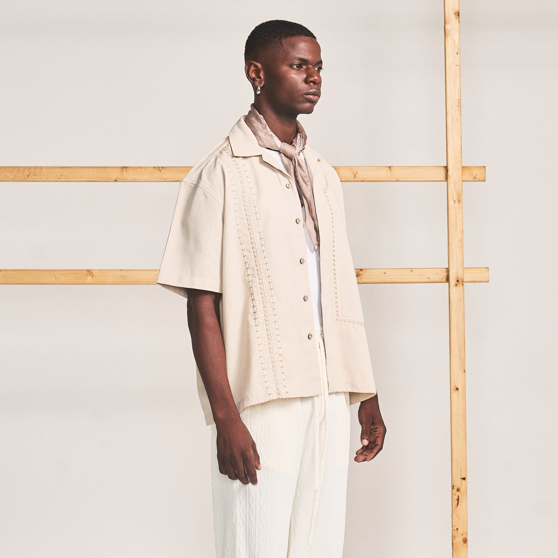 Made in a woven cotton-polyester blended fabric, this shirt features a basic block shaped cut & sew panel on the left side highlighted by a combination of running and cross stitch embroidery. The shirt features additional couching element on the right side with tonal colors used for threads and a simple cuban collar design for finishing touches.