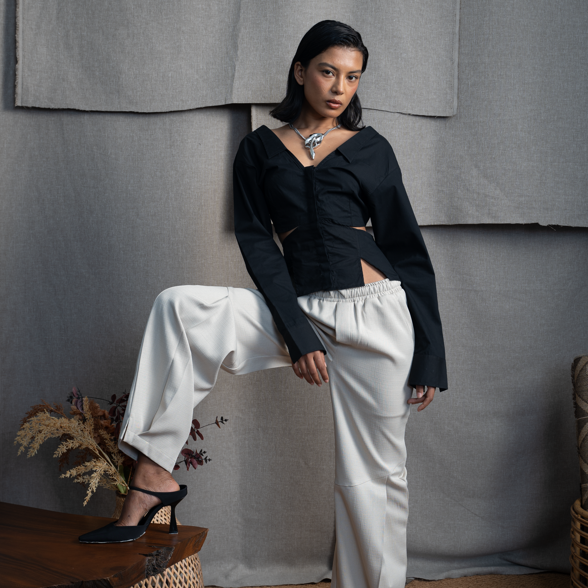 Cotton-Polyester Blended Shirt is made with a Wide Neck Opening and Front To Back Collar detail. This drop shoulder pattern comes with enlarged armholes and a concealed placket. The additional cut out detail on the waist also features elastic-action on back with a center slit on the hem.
