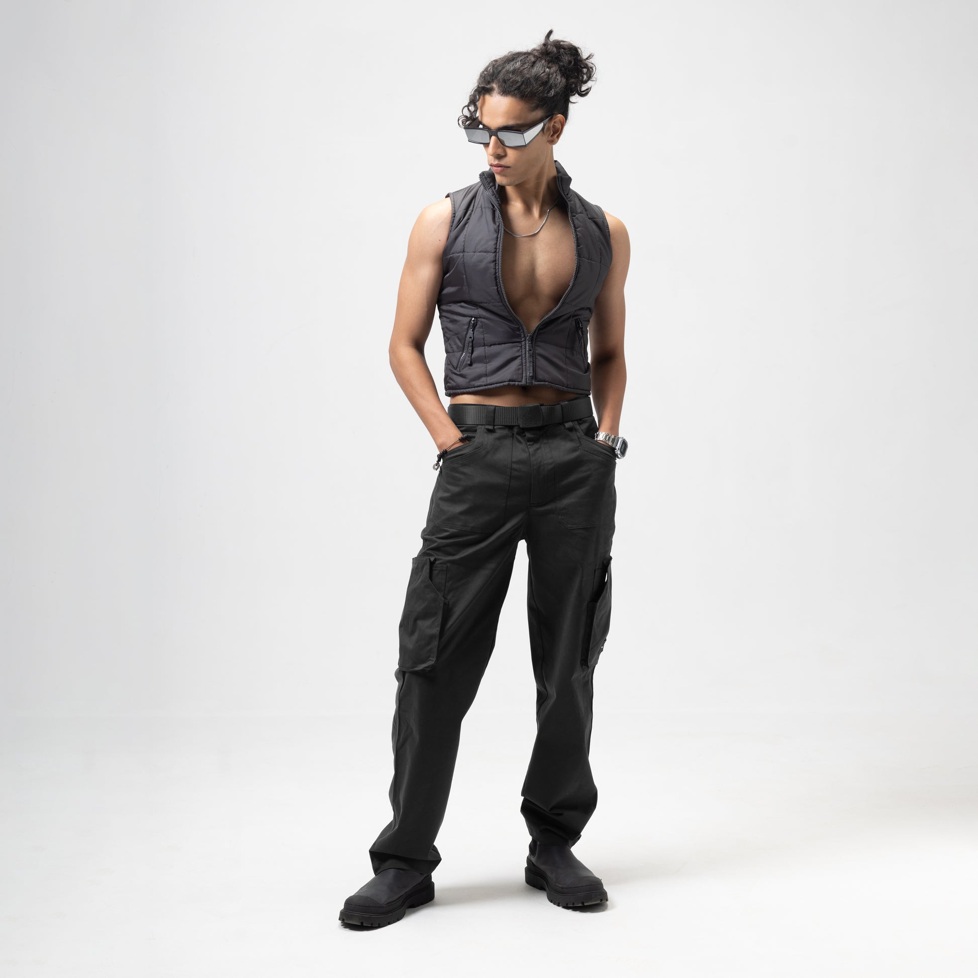 Cargo Type-3 is developed in a 100% cotton fabric using edge-cut as the major design element. The pants feature conventional western seamed pockets with tracing patch pockets on the top. Bottle shaped side pocket design is completed with an underlying coin pocket detail. Carbon finish of the fabric, gives the pants a sleek look making it a clean fit to resort to this season.