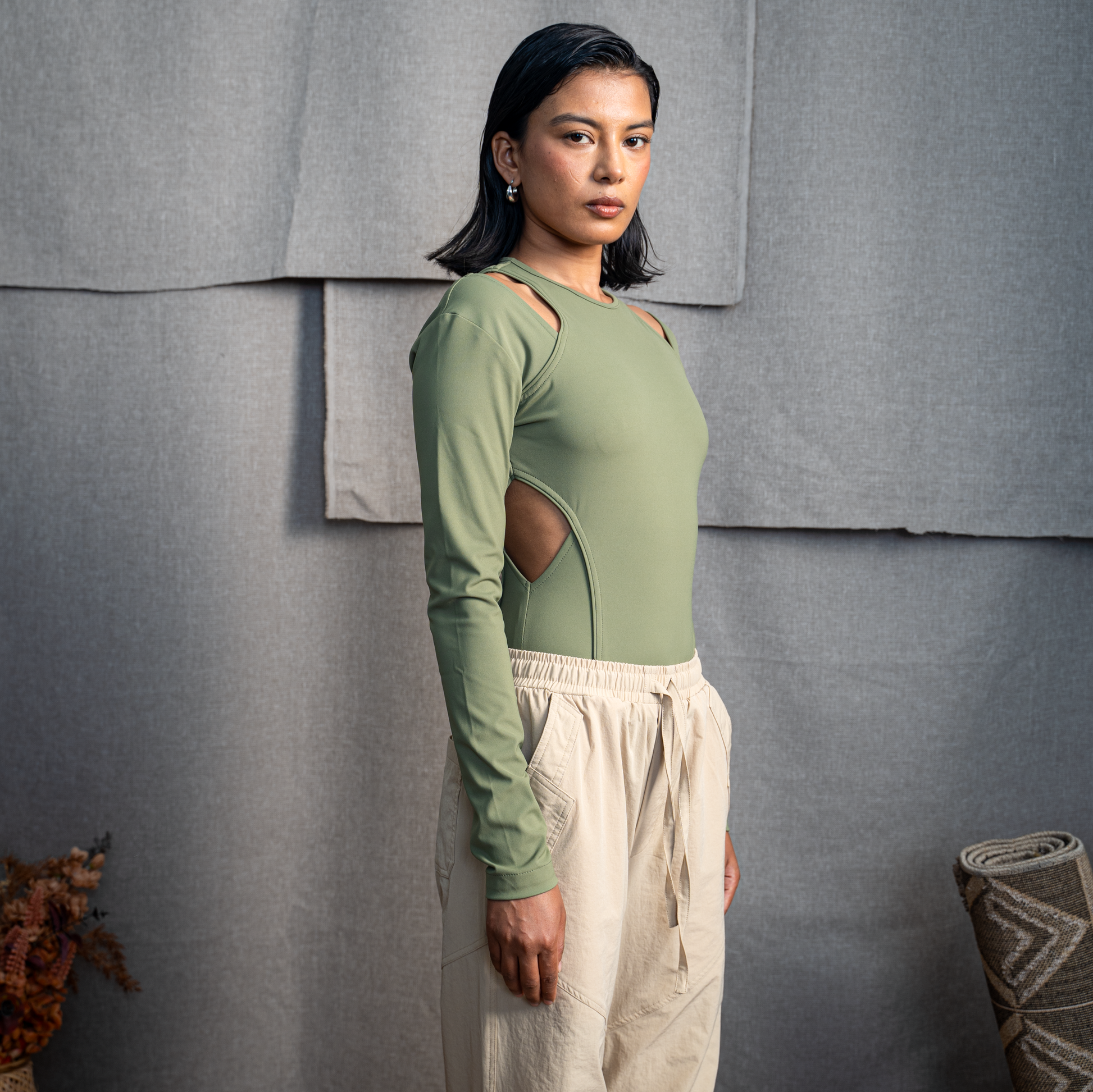 The bodysuit is made in a Nylon Spandex Blended fabric with a 4-way stretch and soft finish. It features an overlapping torso highlighted with a piping outline, minimal cut out details on the shoulder and waist, finished off with a crisp binding fold on the neckline.