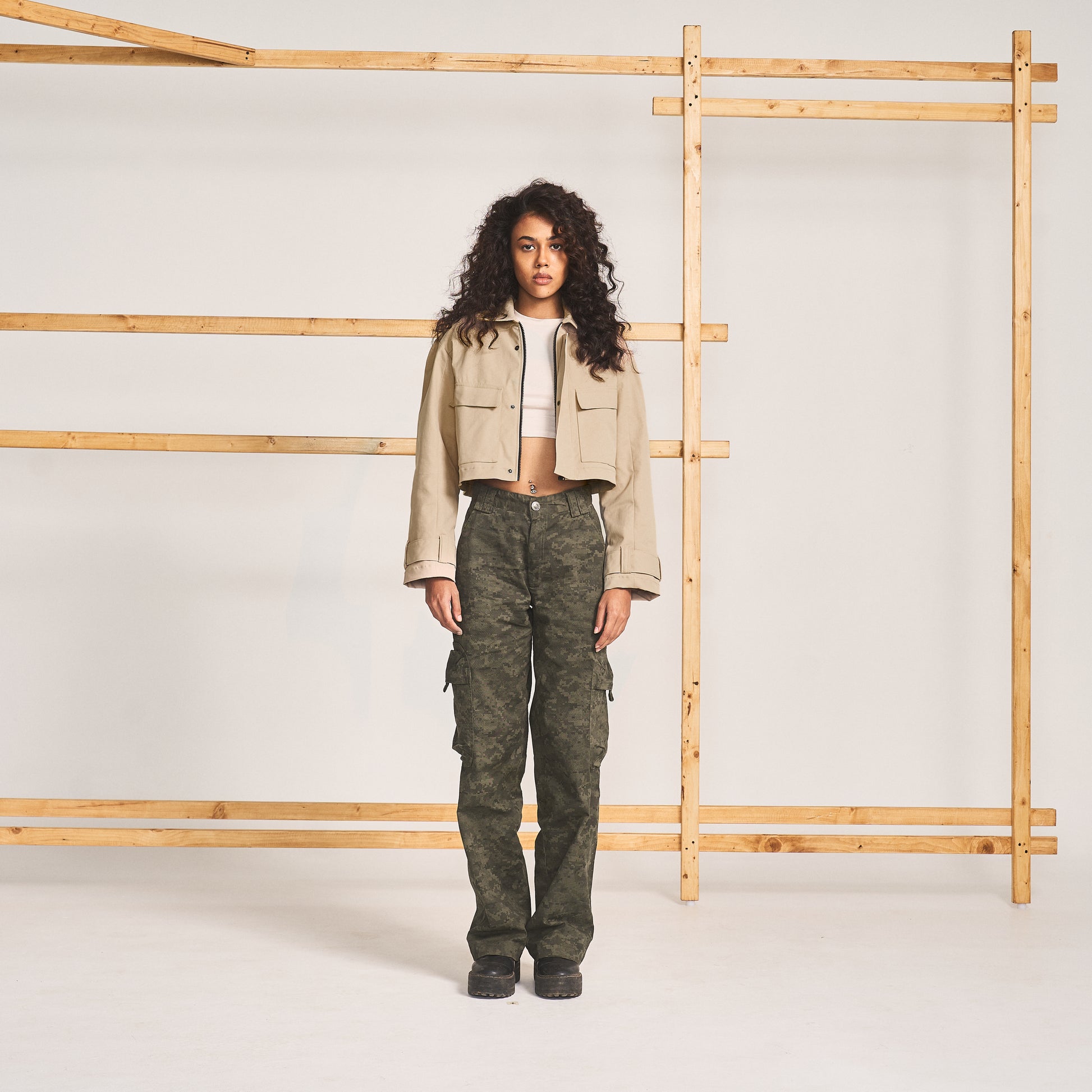Cropped length zipper jacket crafted with extended shoulder panels merging into a three piece sleeve. The jacket features wide concealed placket with snap buttons, slanted patch pocket with side and top opening, finishing off with an adjustable strap at the sleeve opening.