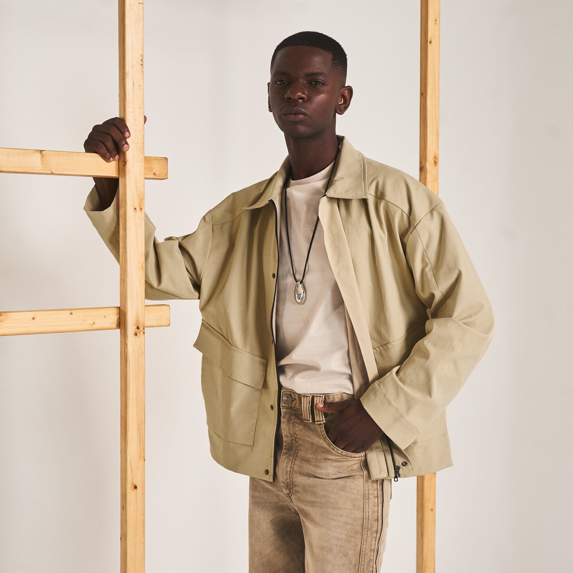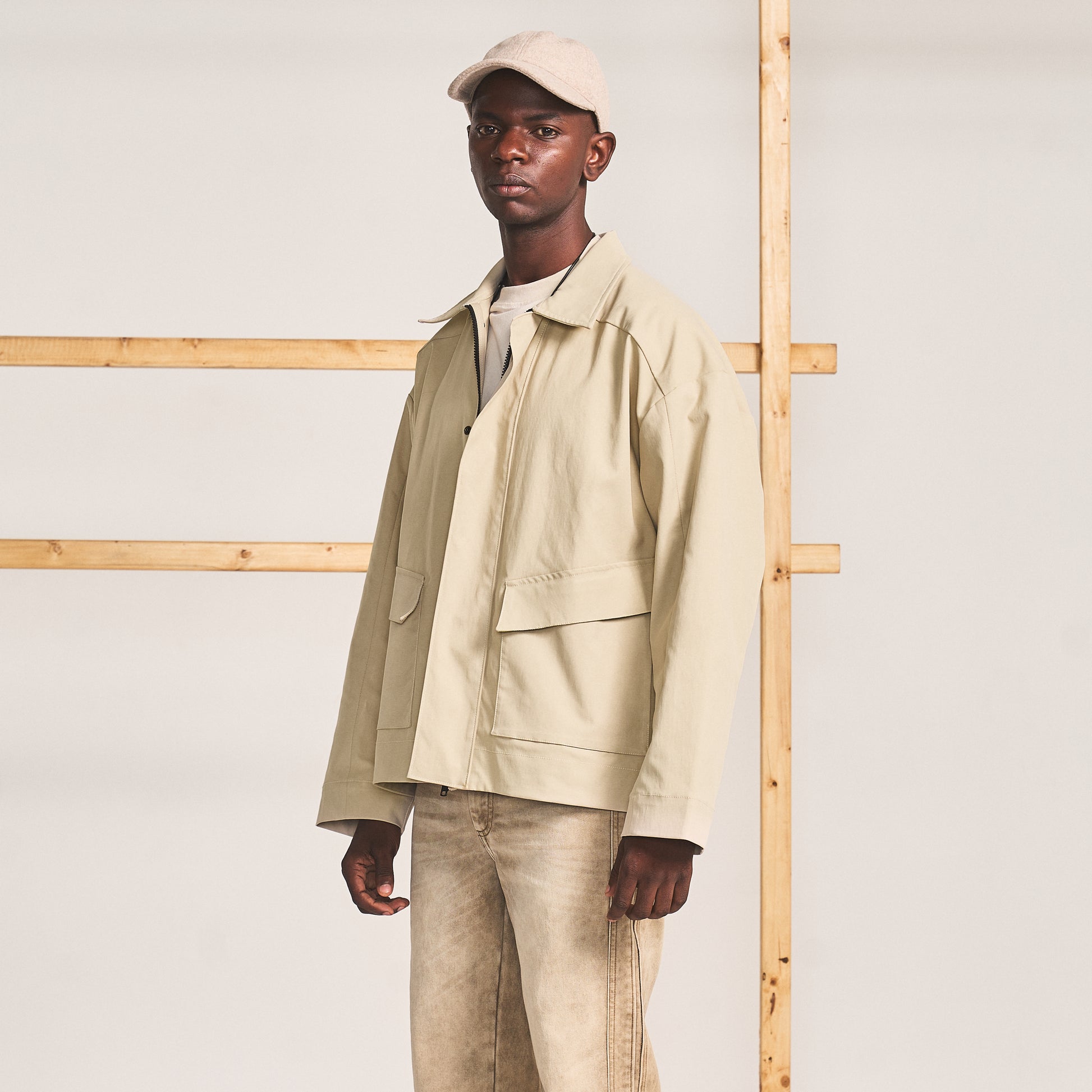 Full length zipper jacket crafted with extended shoulder panels merging into a three piece sleeve. The jacket features wide concealed placket with snap buttons, slanted patch pocket with side and top opening.