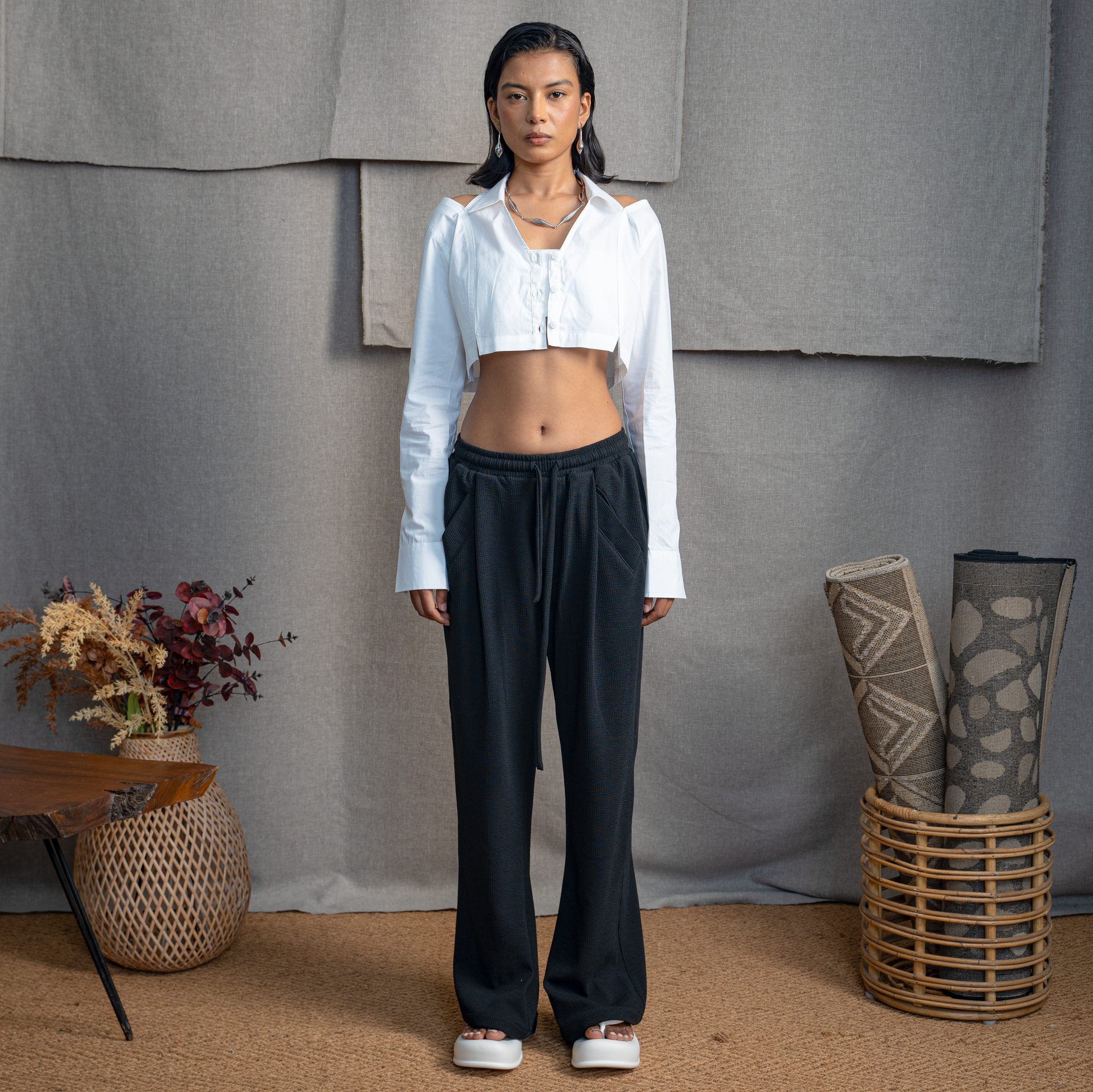 Cropped Cotton-Polyester Blended Shirt tailored with slim sleeves, long cuffs and a one piece collar. The rounded panels on the front and back feature slit openings, finished off with cut out details on the shoulder.