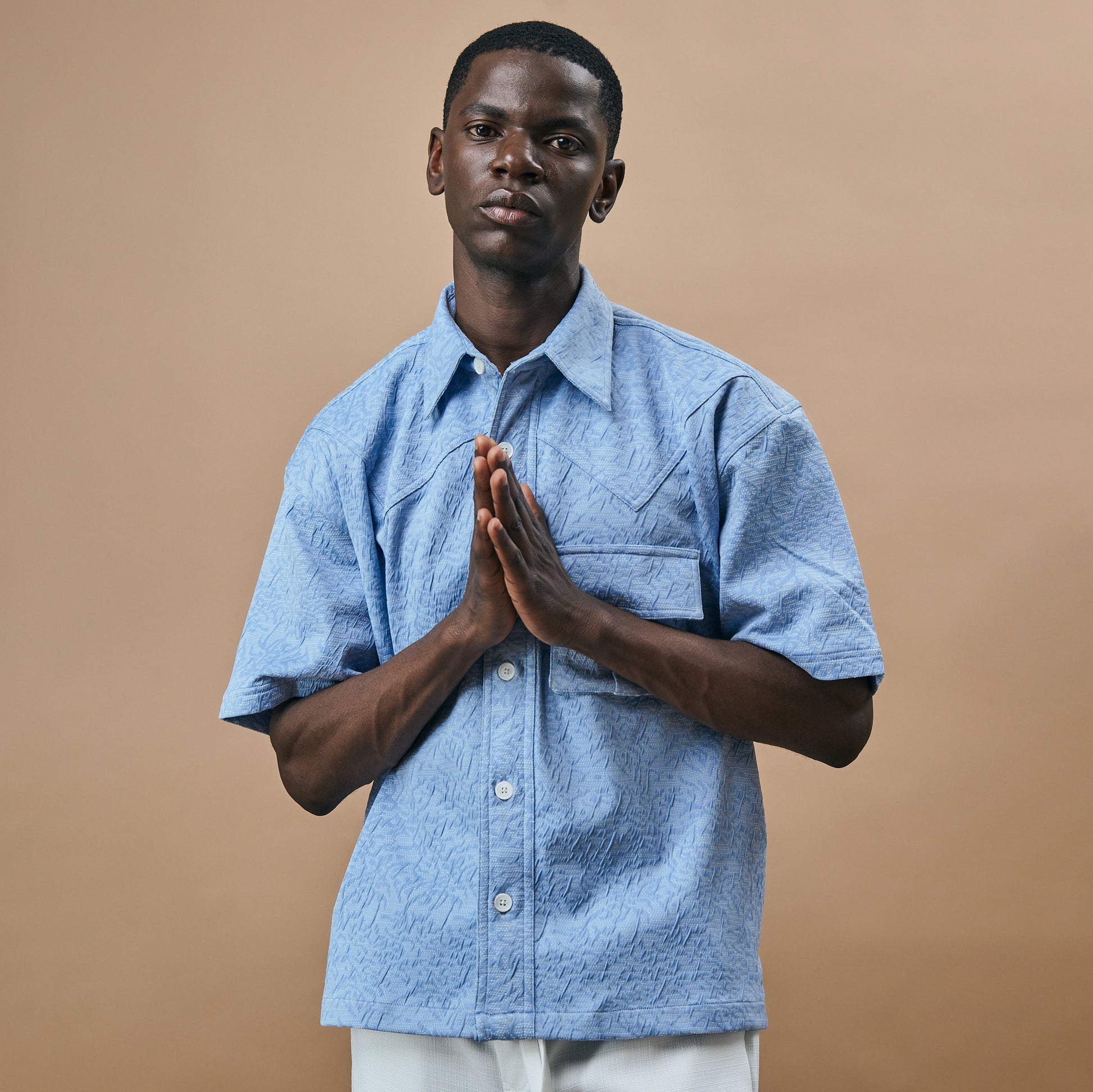 Box fit Shirt made with a Polyester Knit Fabric showcases an Abstract jacquard embossed pattern. The shirt features a W shaped cut & sew front panel with Box Pleated 3D Chest Pocket.