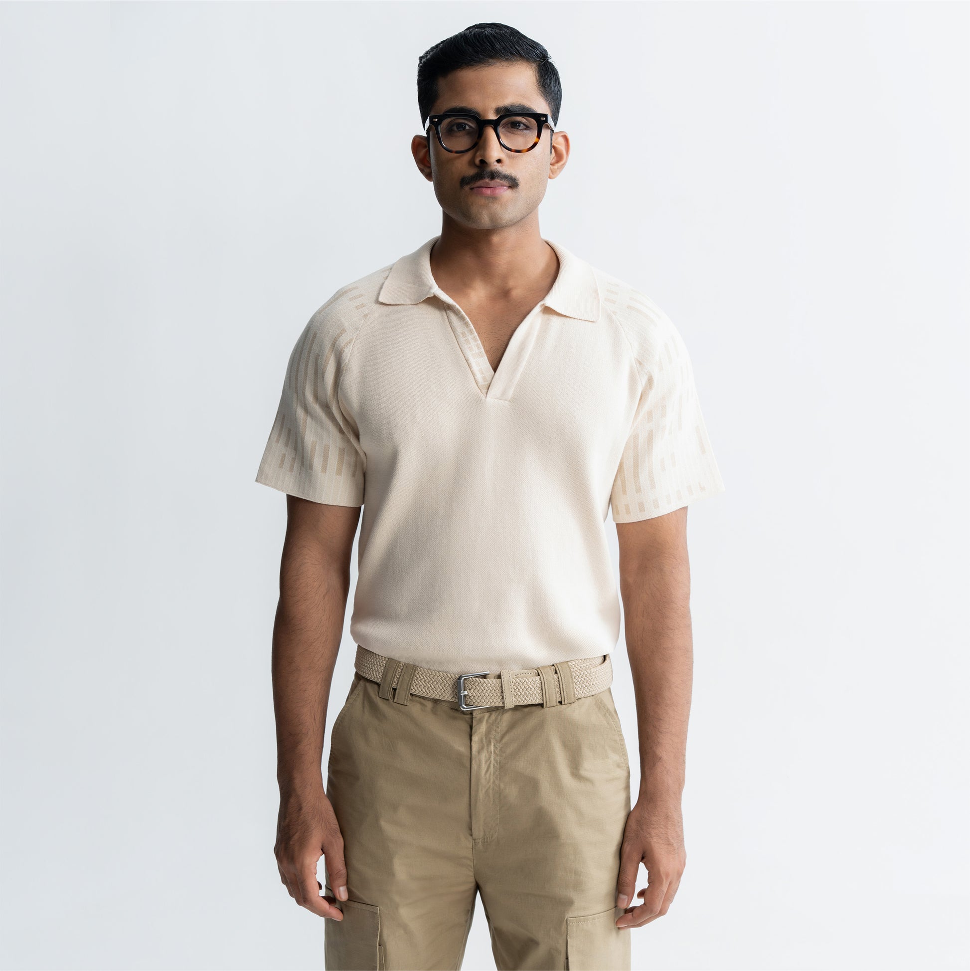 Flat knit polo T-shirt crafted in a tonal jacquard pattern with clean and relaxed fit. This T-shirt features patterned raglan sleeves and bottom collar placket that add quiet detailing, while the minimal finish keeps the silhouette sharp and understated.