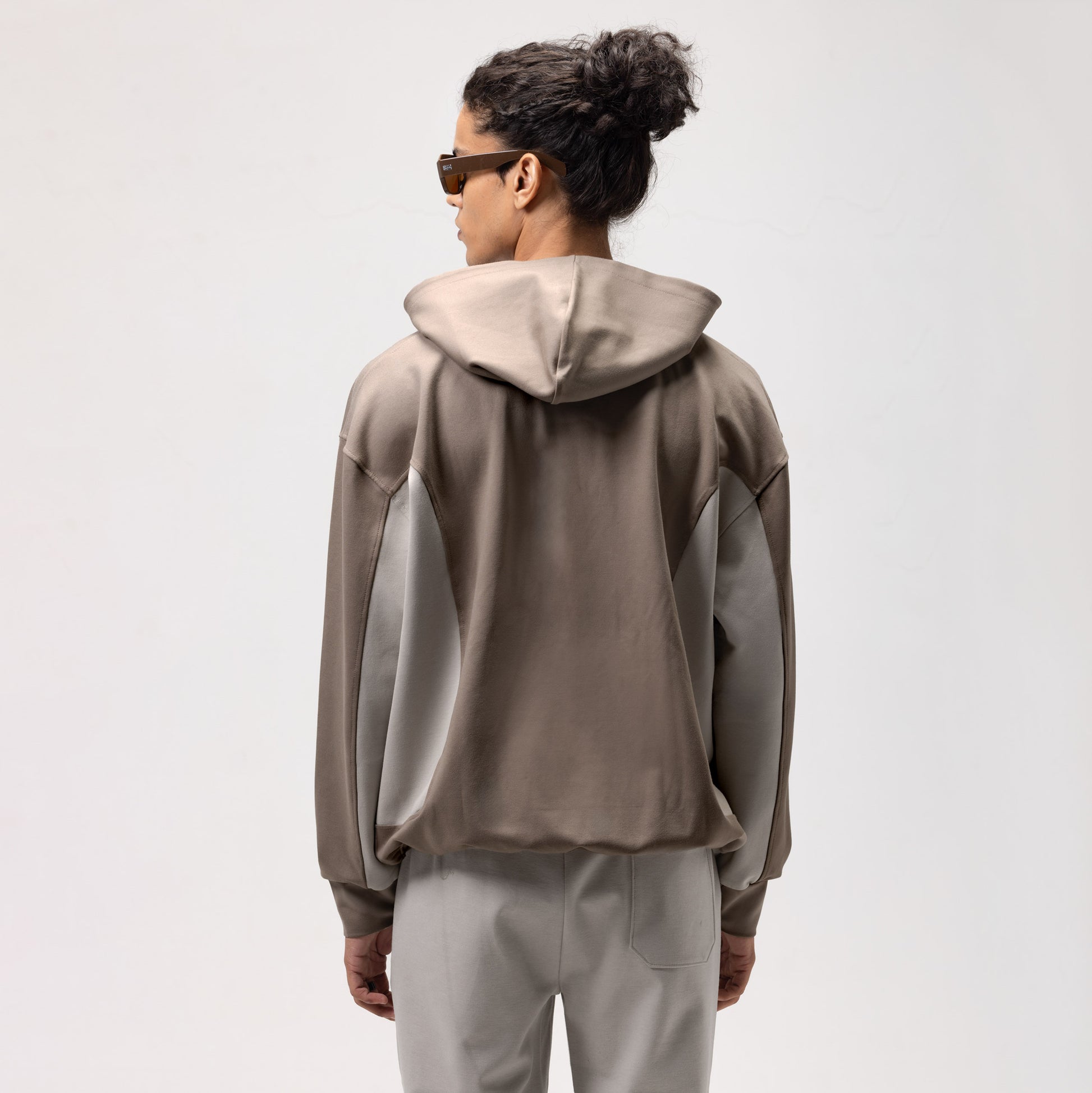 Hoodie made in our classic 380 GSM nylon rayon blended fabric. Tailored with curvaceous cut and sew colour blocking panels in an oversized fit. Features a contrast hand warmer patch pocket with our rubber branding.