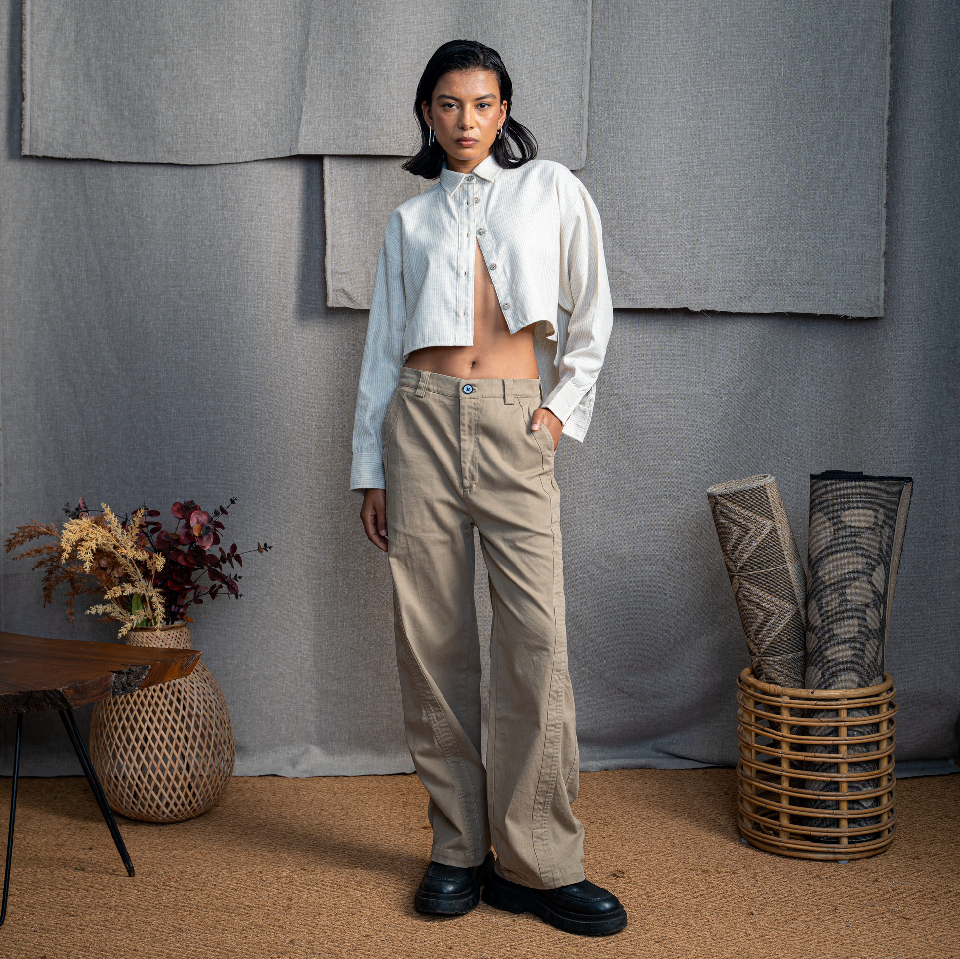 Paneled wide leg pants made in cotton drill fabric with an enzyme wash. Featuring front and back curved panels with concealed side pockets on the front and patch pockets on the back.