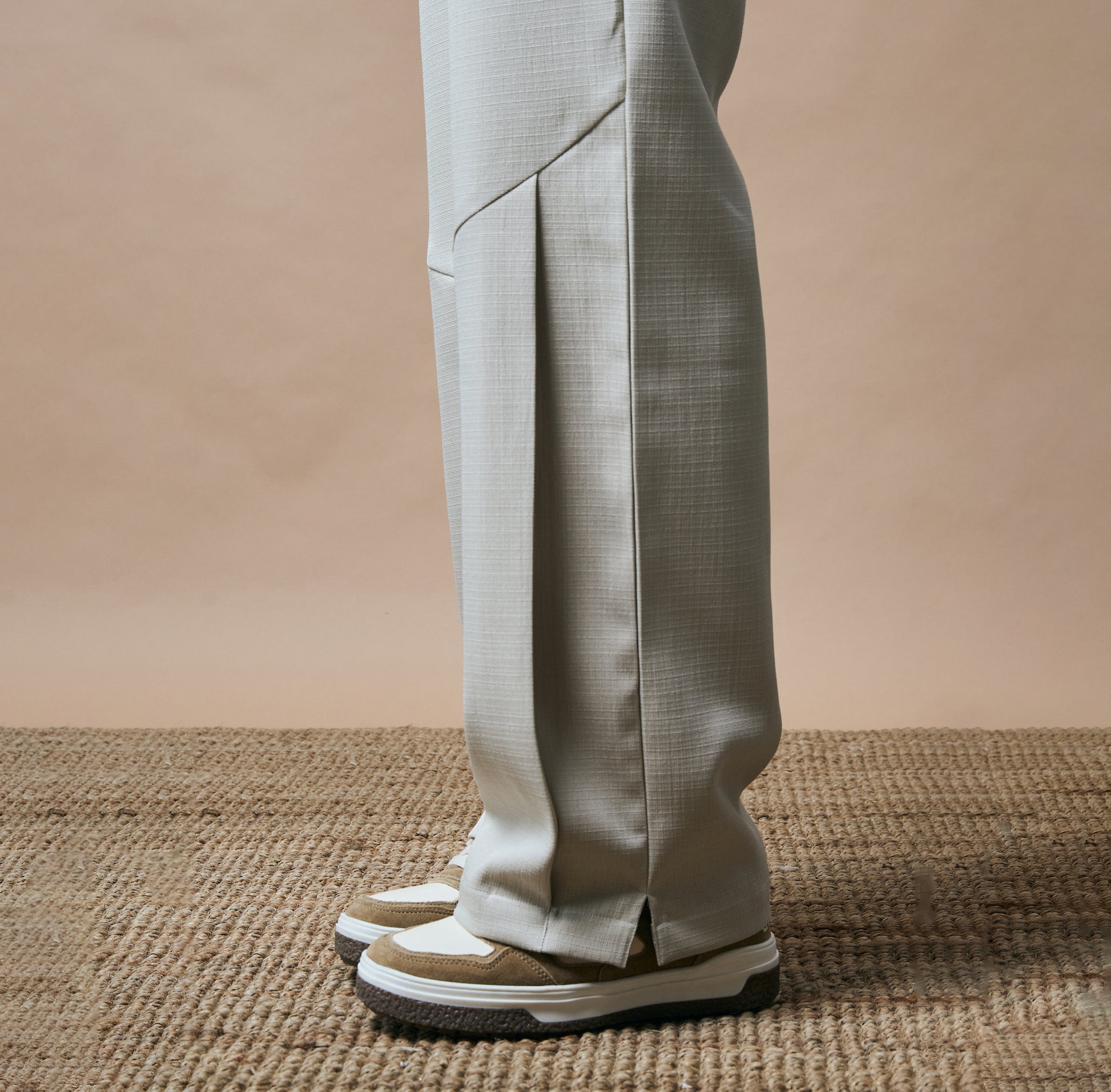 Pants made in Polyester Blended Fabric feature Arch Cut Panel on the knee with an attached pleat. The straight fit pants come with Classic Side Pockets, a side slit on the outseam and an elasticated waist band.