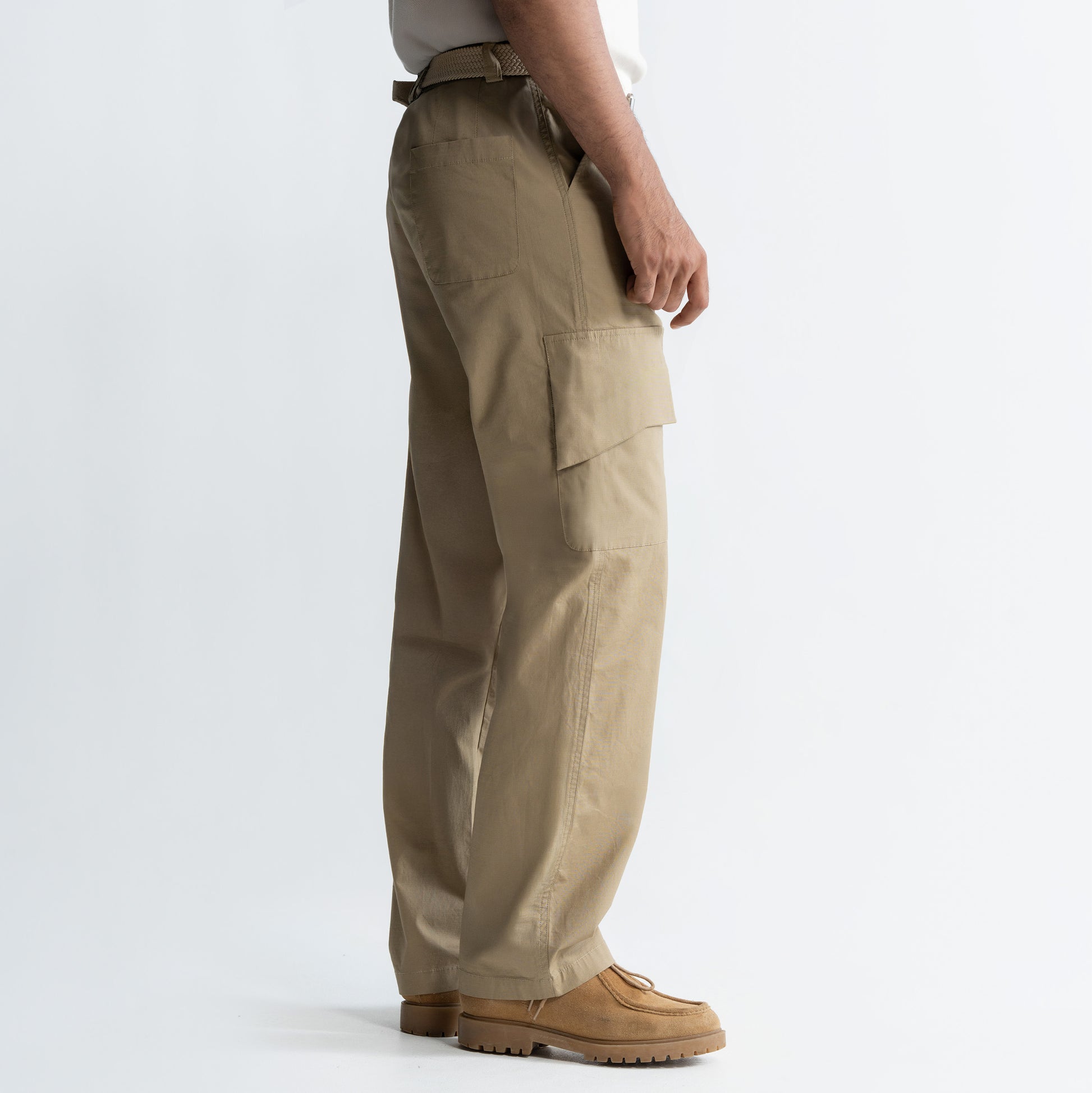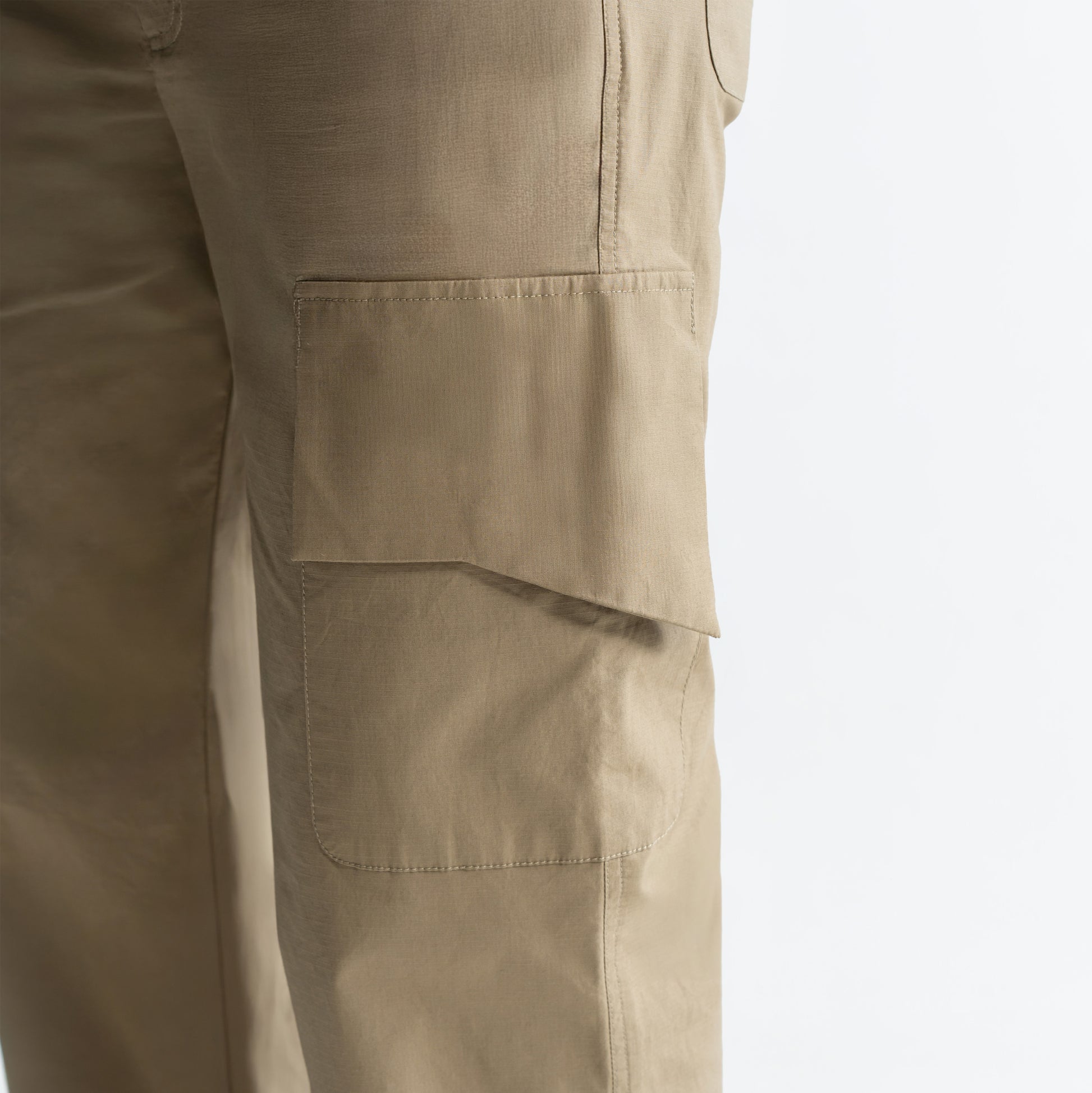 Constructed in a cotton ripstop fabric, these cargo pants are designed for durability with a refined finish. Angular cut pocket flaps add a sharp detail to the utilitarian silhouette. The waistband features a clean button closure with concealed elastic, offering comfort while maintaining a structured look.