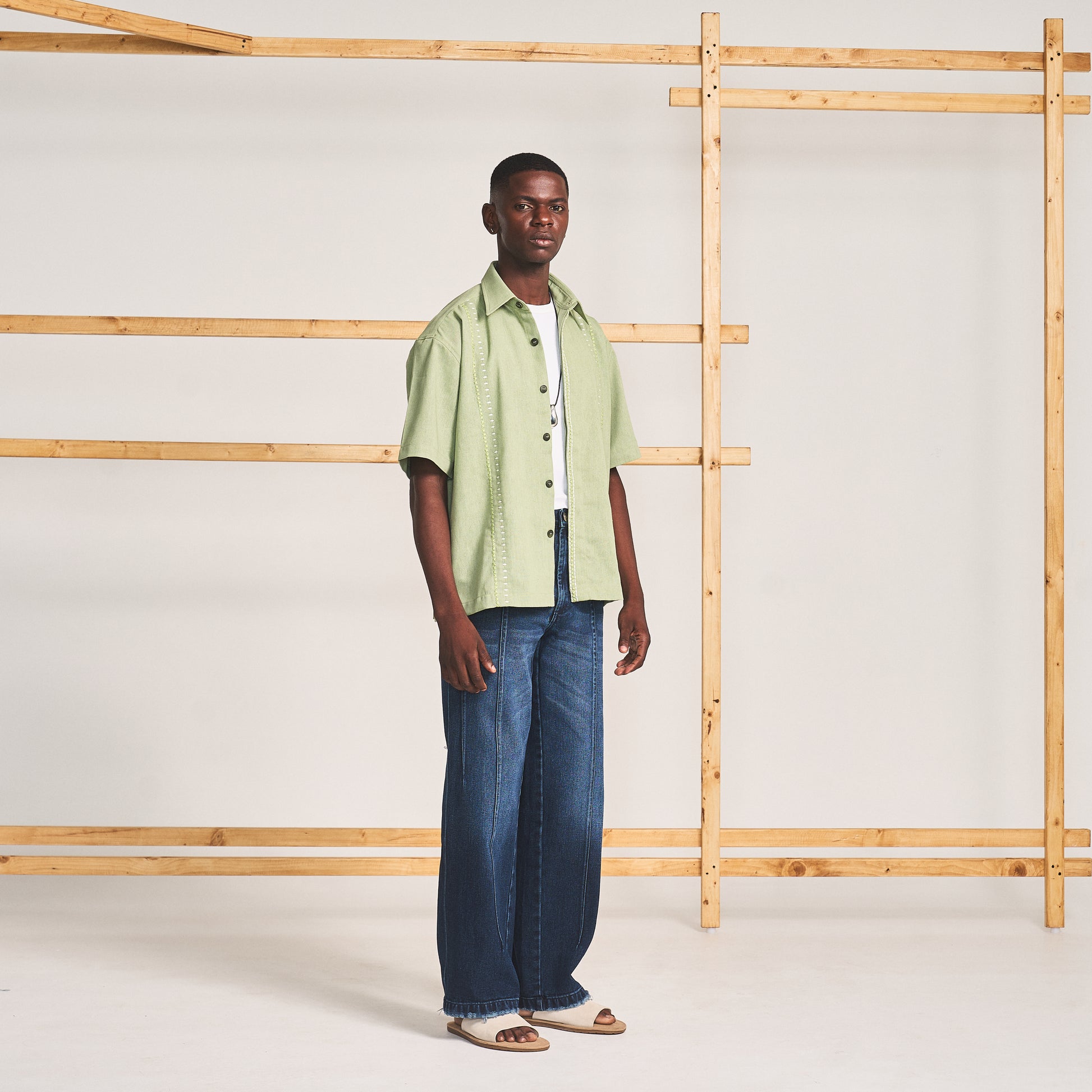 Cotton-polyester blended shirt made using a simple cut&sew detail on the front featuring contrast thread tacks and tonal cross stitch embroidery. The shirt comes with a concealed placket design highlighted by our classic running cross stitch thread work; finishing off with two box pleats on the back.