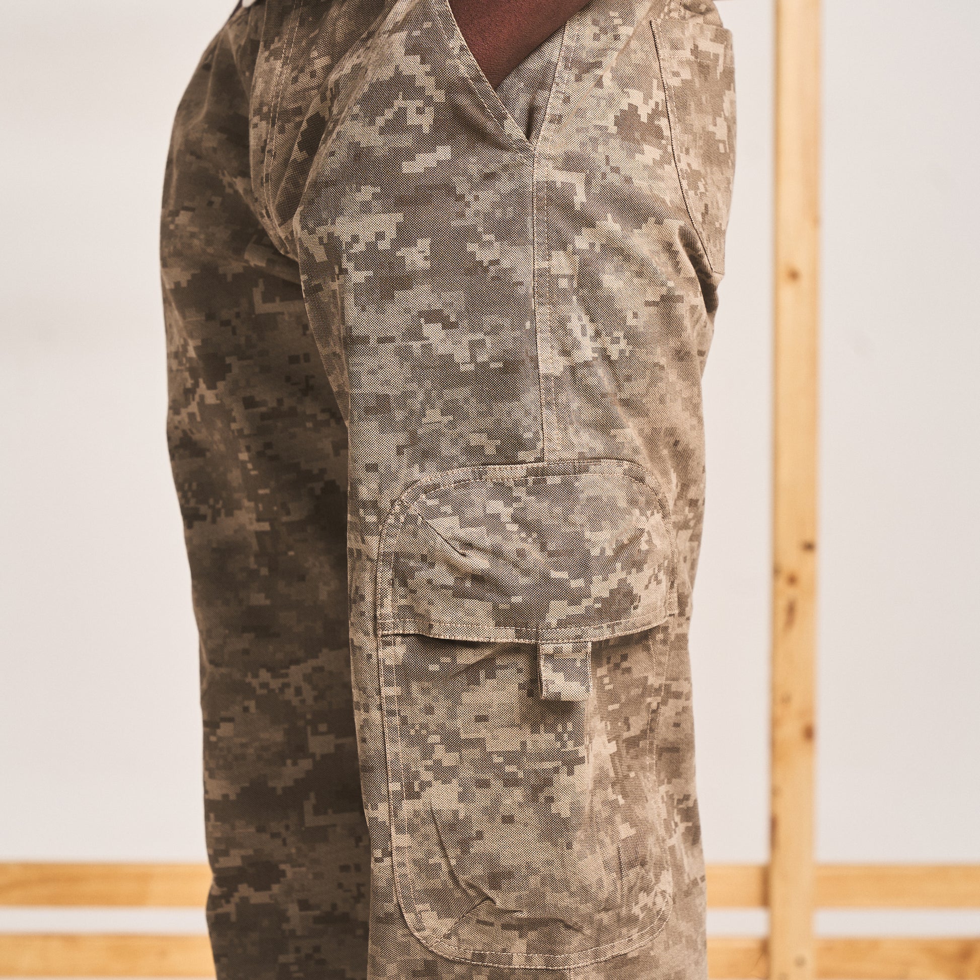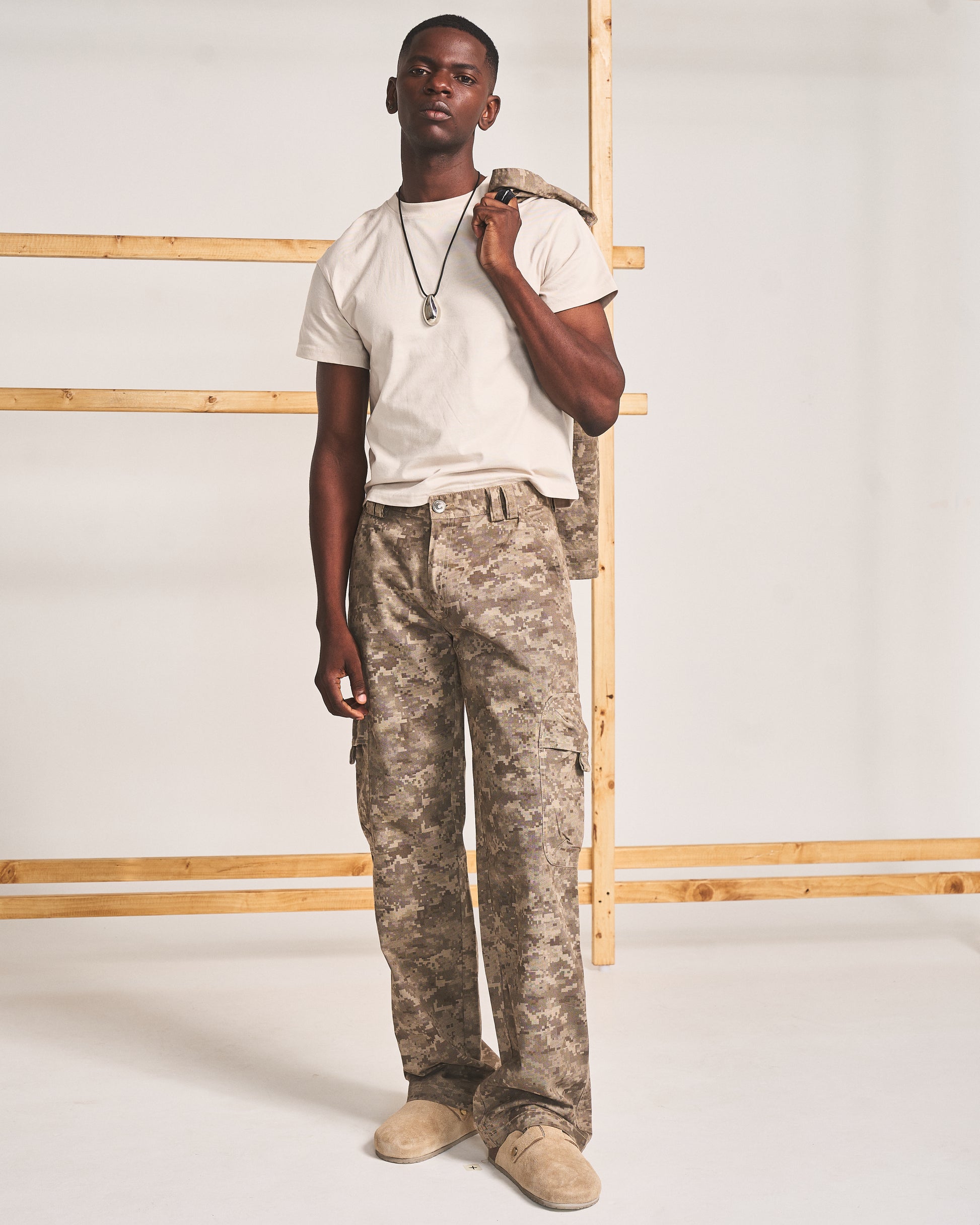 Straight leg pants made in 100% cotton fabric with a pixelated camouflage print. The pant comes with classic side pockets, darted oval patch pocket with loops on the side seam and a branded metal button.