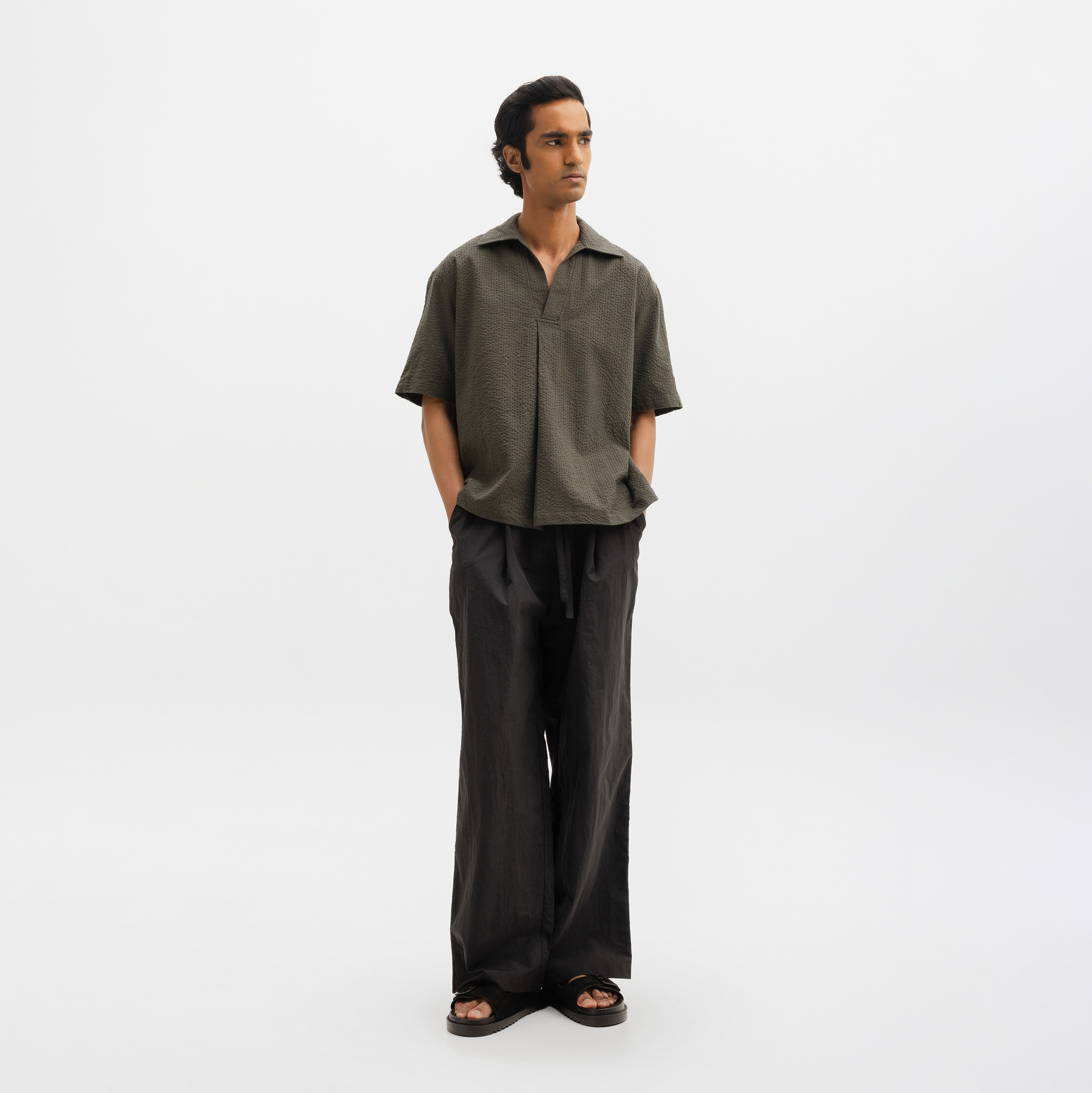 Crafted from crush textured nylon, these pants feature a fluid wide-leg fit. Three-inch front pleats add structure and movement, creating a balance between ease and sophistication.